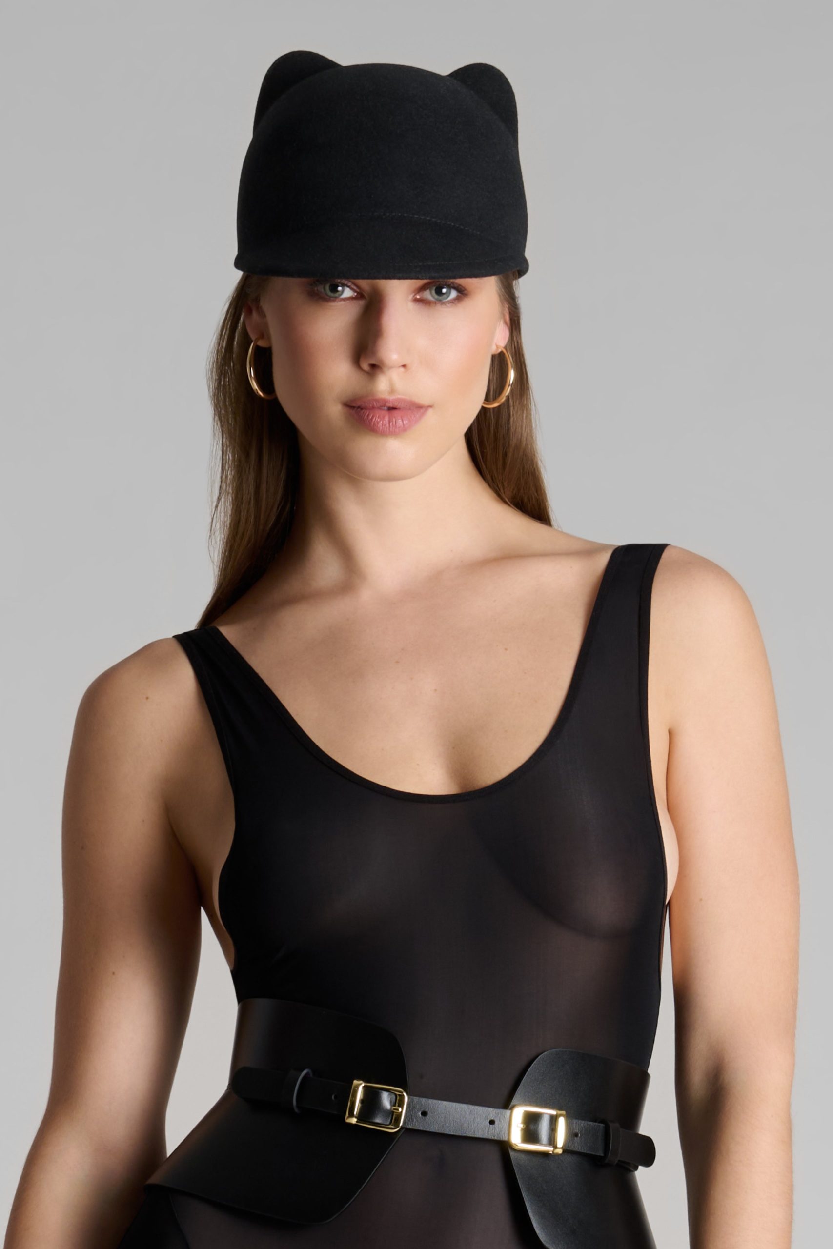 The Cat Hat is a piece as playful as it is refined. With its short visor and two feline ears, it evokes a barely whispered secret, a duality between innocence and daring. Crafted entirely from black wool, it conceals inside a violet grosgrain ribbon, Maison Close’s signature color, for a discreet yet assertive touch.