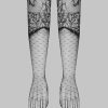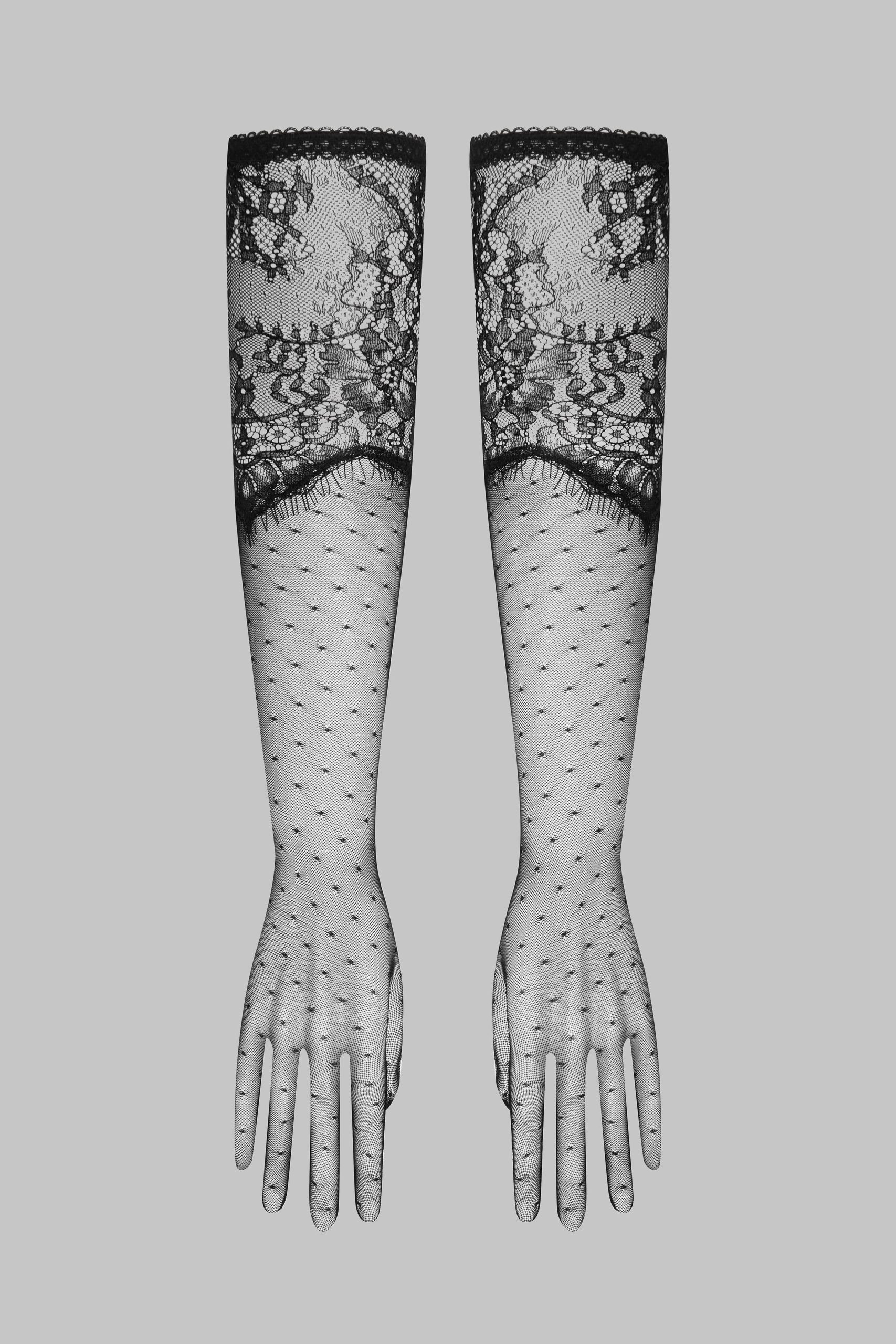 Opera gloves combining rigid eyelash lace and stretch Swiss dot mesh. A stylish way to dress up your hands and forearms. Stitched elastic seams that provide good support.