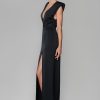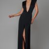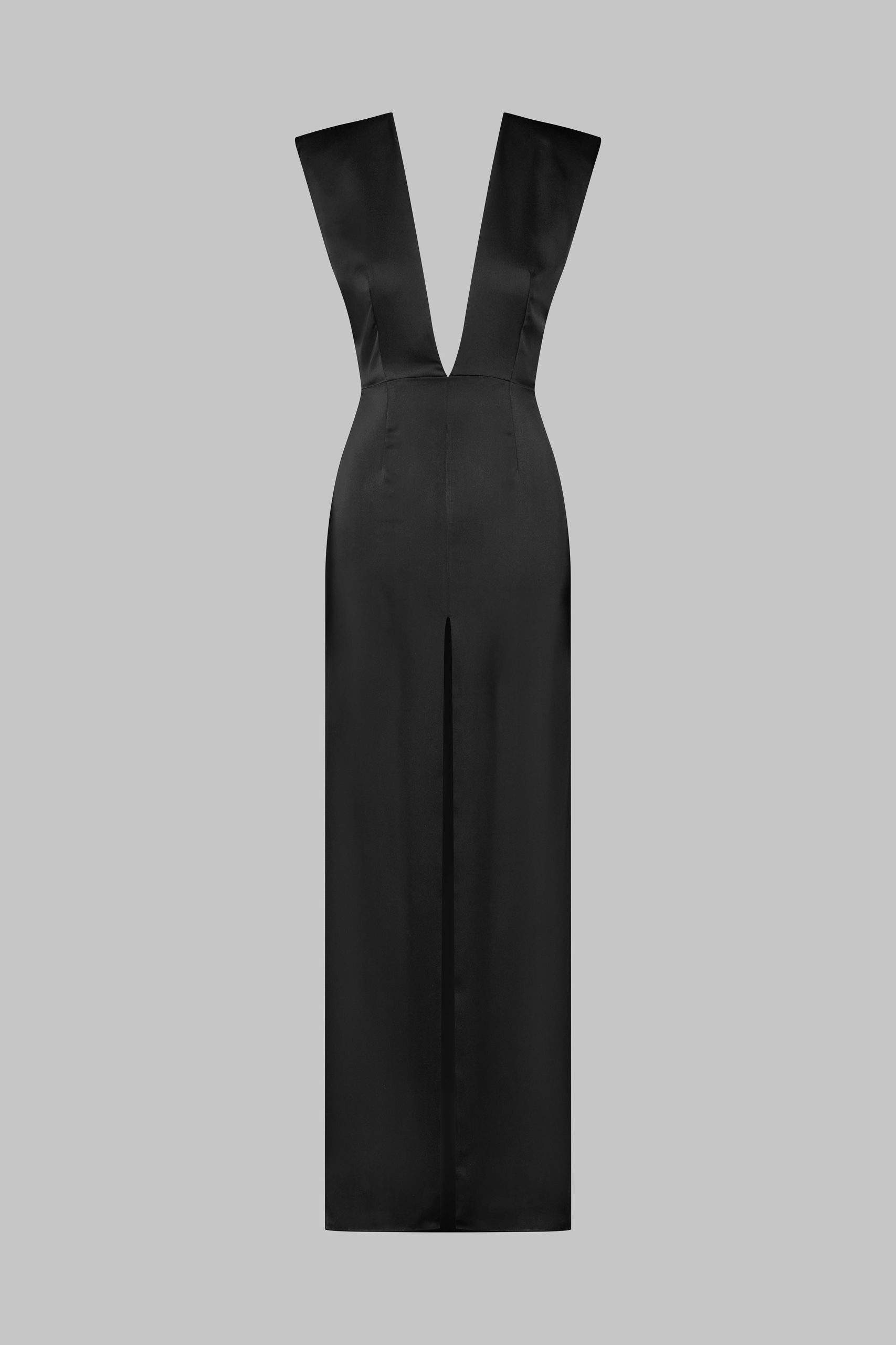 This long dress is characterised by its straight cut and fitted waist. The striking satin-lined shoulder pads create a strong, structured silhouette. It is made from double-sided opaque satin for softness, a flowing style and incomparable quality. It has a seductive look with its double deep V neckline at the front and back. In the centre, a bold slit shows off the front of the legs. An invisible zip fastening on the side emphasises the impeccable fit of the waist.