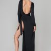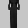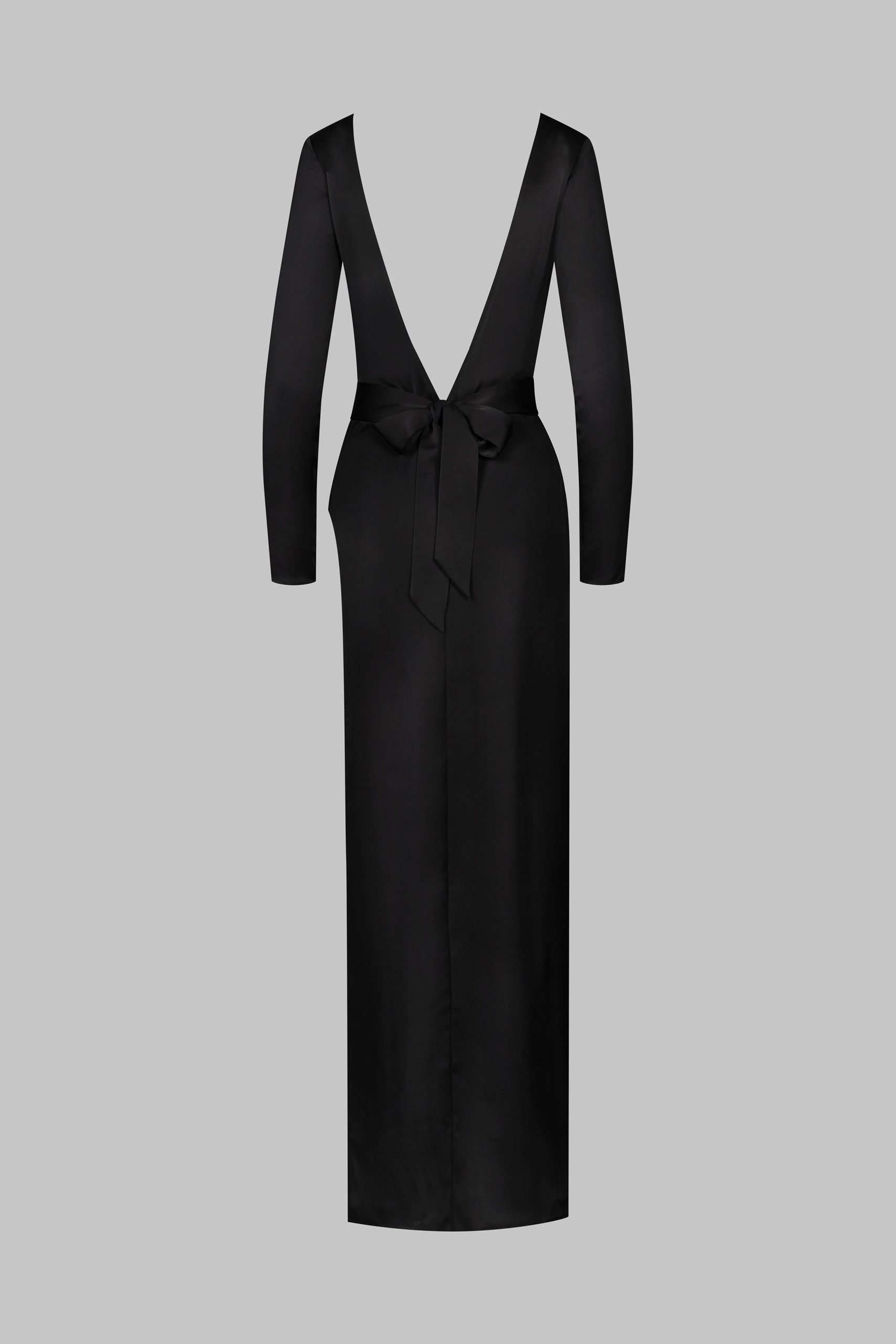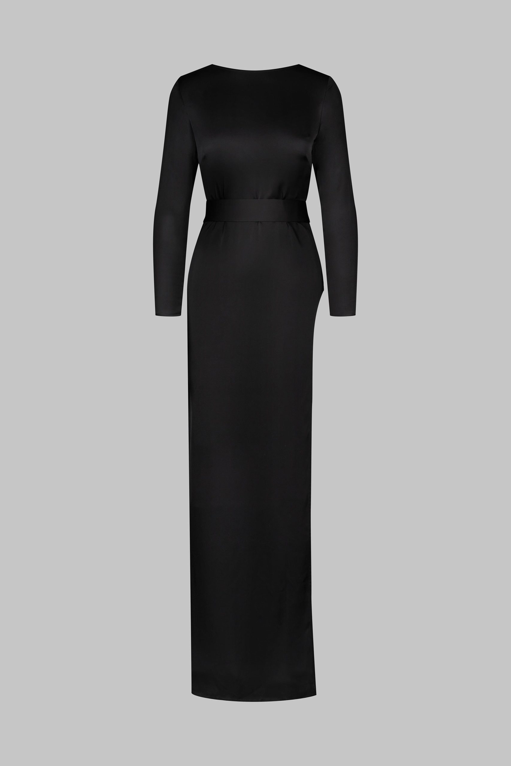 This backless dress stands out for its long, straight cut, which hugs the body and creates a sleek, assertive silhouette. It is made from double-sided opaque satin for softness, a flowing style and incomparable quality. A deep plunging vee at the back and a design that opens all the way up to the top of the leg is sure to turn heads. The boat neck emphasises a graceful neck. A wide, removable satin belt gives you structure at the waist.
