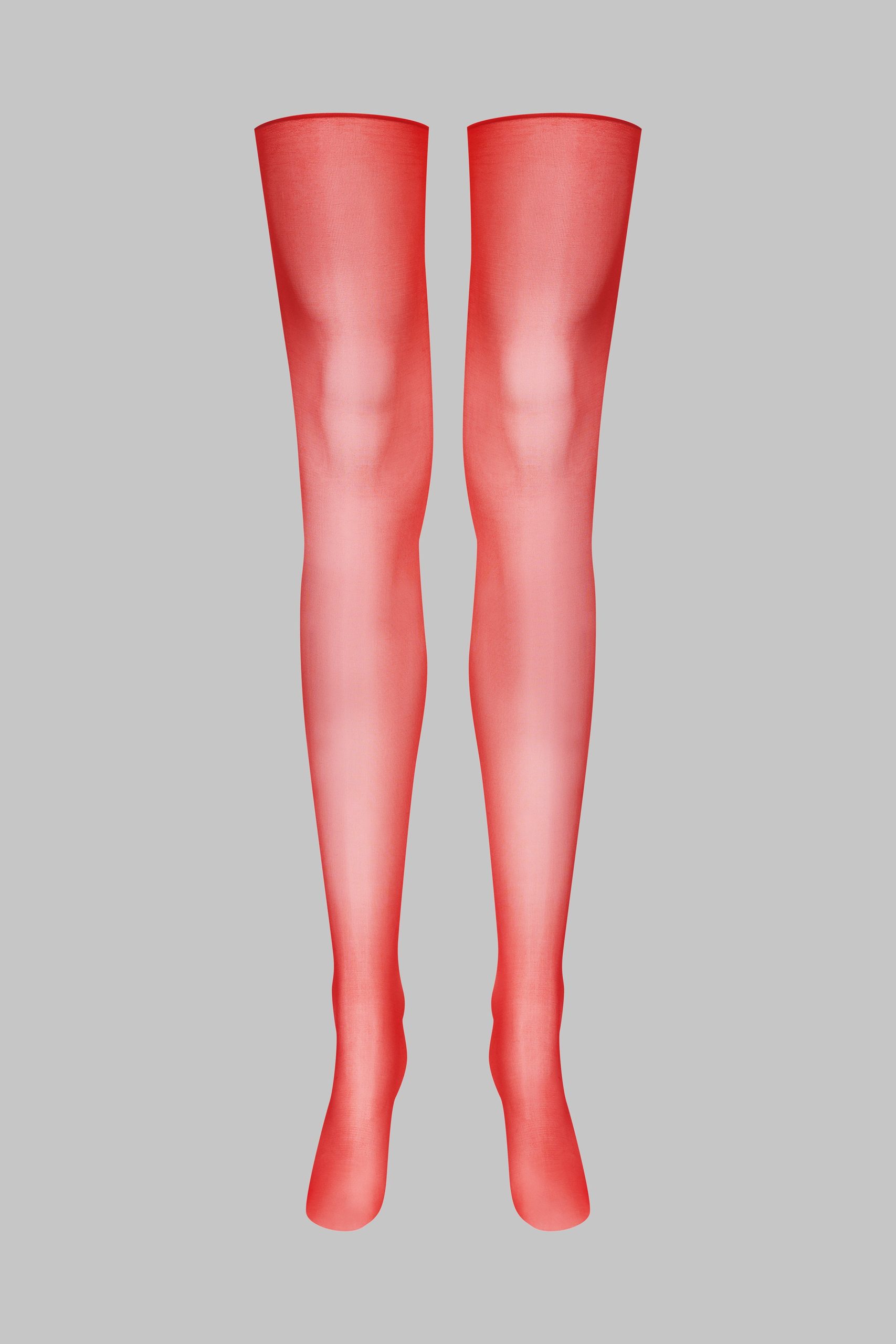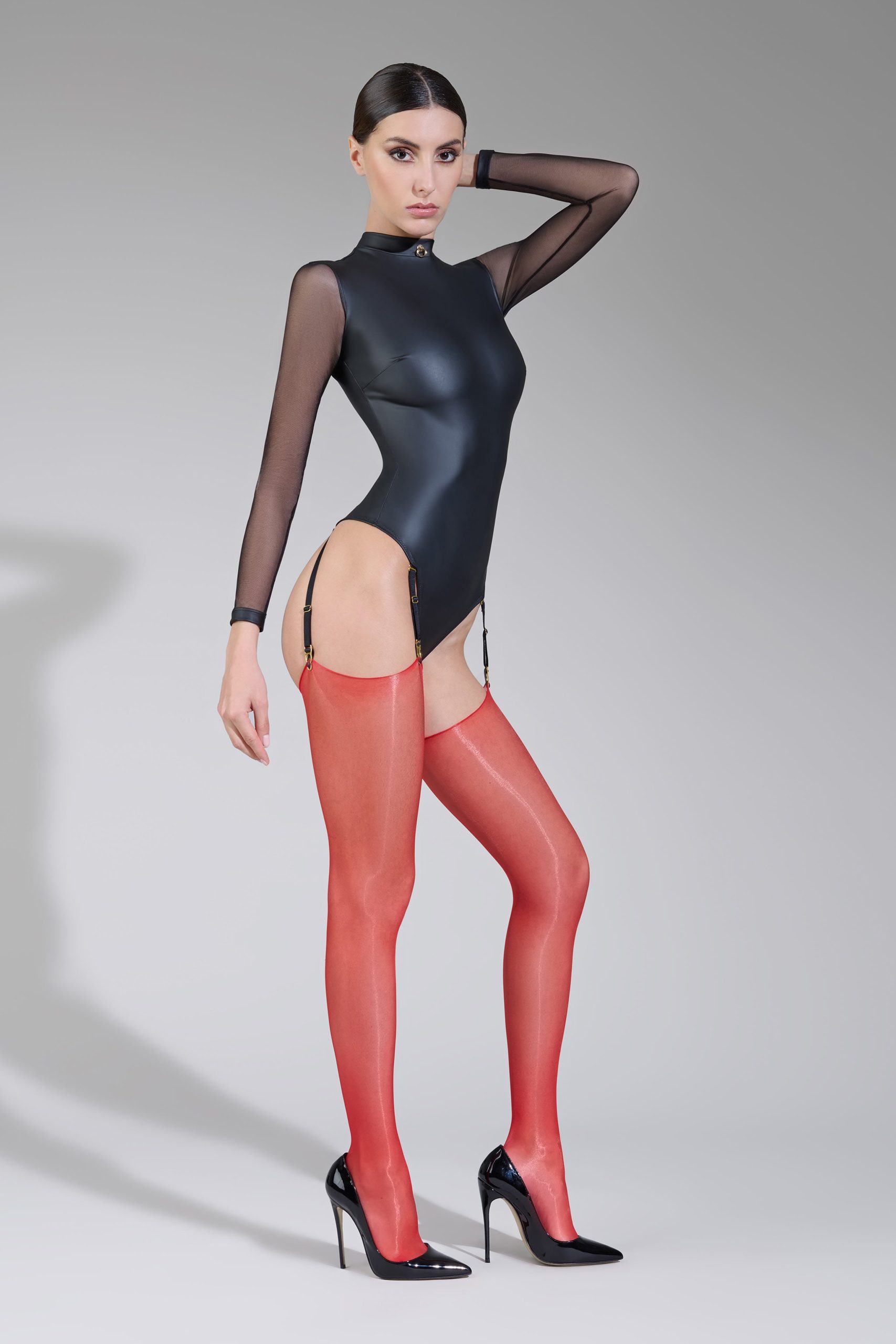 Maison Close’s signature cut and rolled stockings now come in an ultra-shiny version. The unique oiled effect combined with the exclusive red define an ultra-feminine, bold look. Held in place by a Maison Close suspender belt, they elongate the figure without leaving any marks.