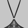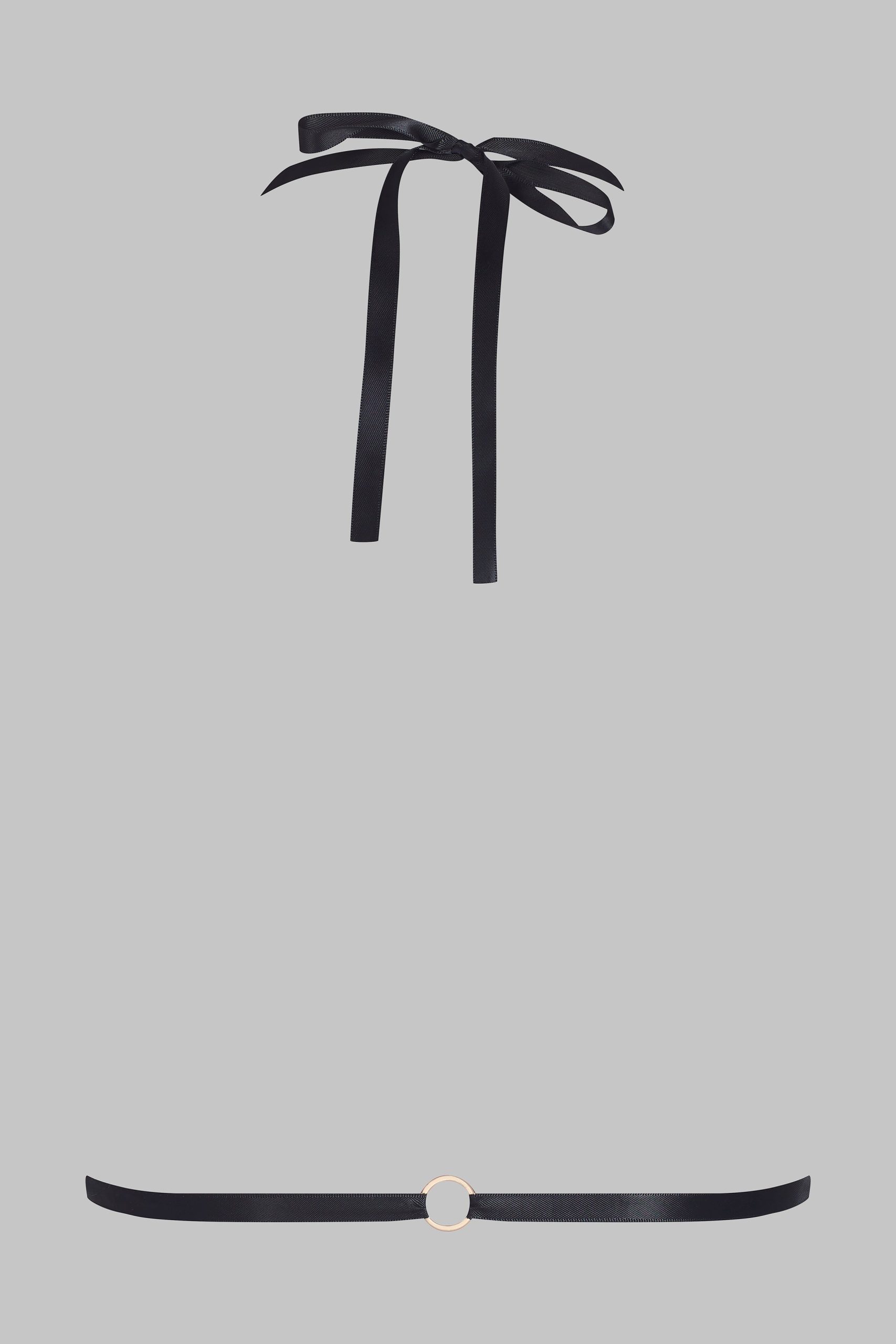 Harness made of fine guipure that wraps around the neck and under the bust. It’s like jewellery against the skin, adorning and accentuating the cleavage. Wear on its own or with something from your wardrobe. Delicate satin ribbons that can be adjusted at the back with fine gold accessories and tied at the neck or left untied, to suit you.