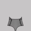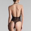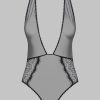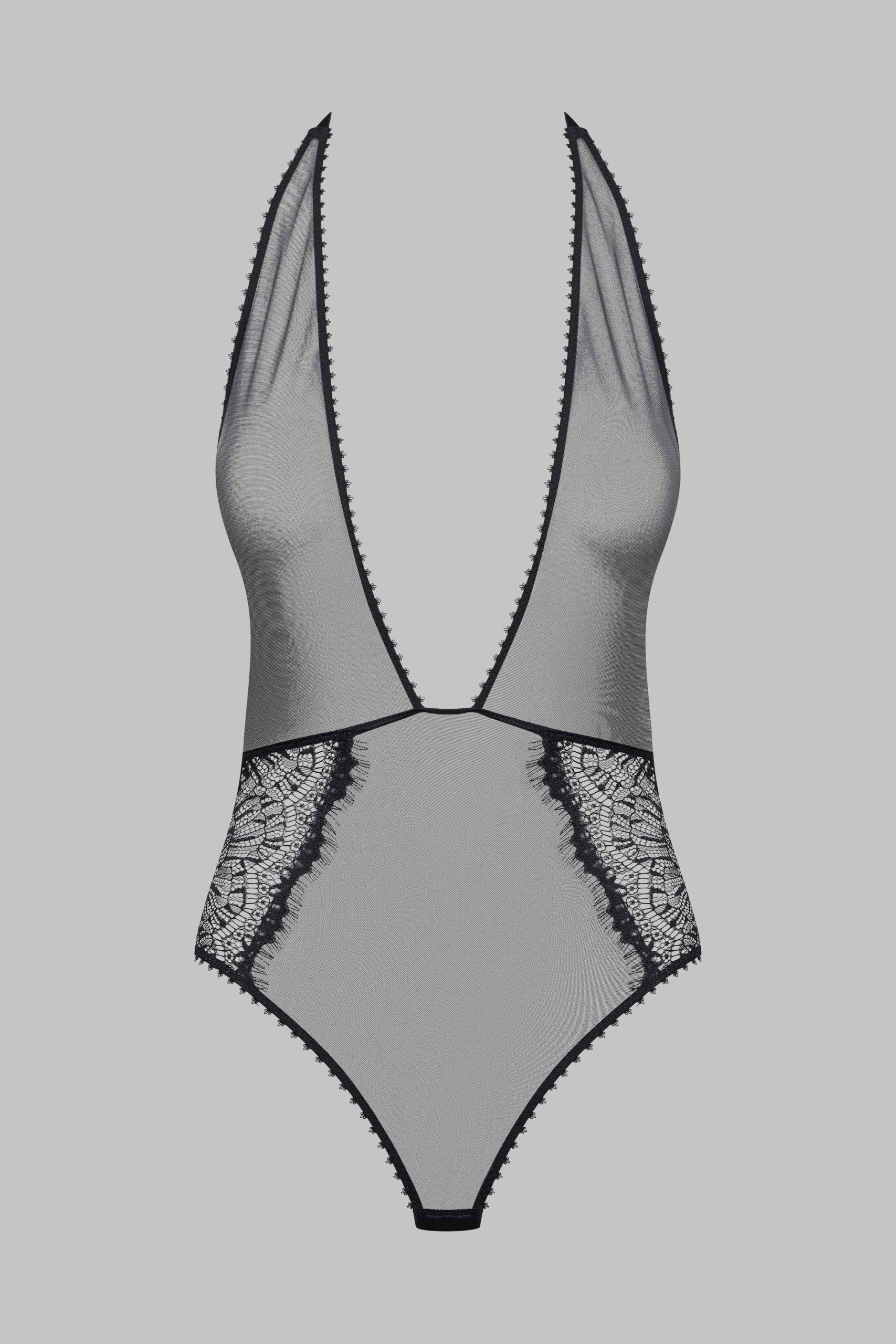 Body string in recycled lace. Shape combining an eyelash lace with see-through tulle edged with picot elastic. A graphic cut that accentuates the silhouette with its deep V neckline and bare back. Adjustable elastic fastening and a gold-tone fastener at the neck. Can be opened and adjusted at the crotch.