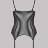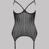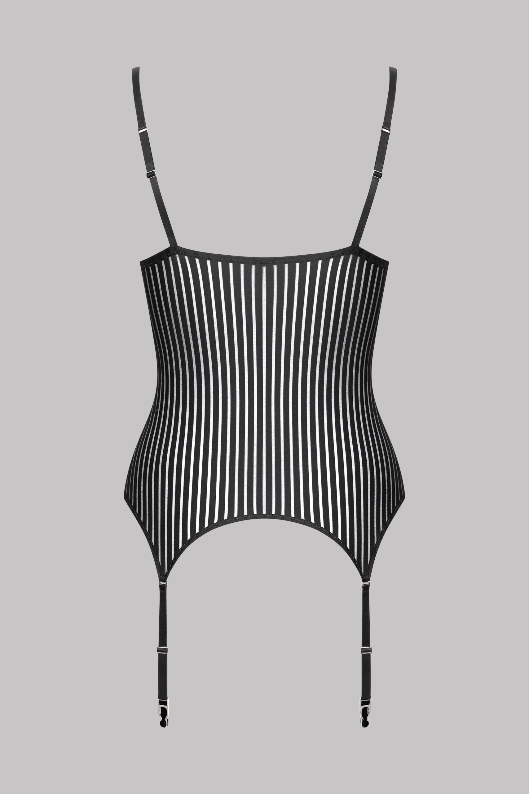 Microfibre cupless jumpsuit with openwork, transparency and graphic stripes. Underwired below bust outlines the curve of the breast and provides excellent support. Elasticated adjustable fixed straps at the back. 4 adjustable and removable suspenders with silver ornamental trims.
