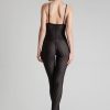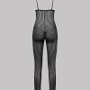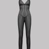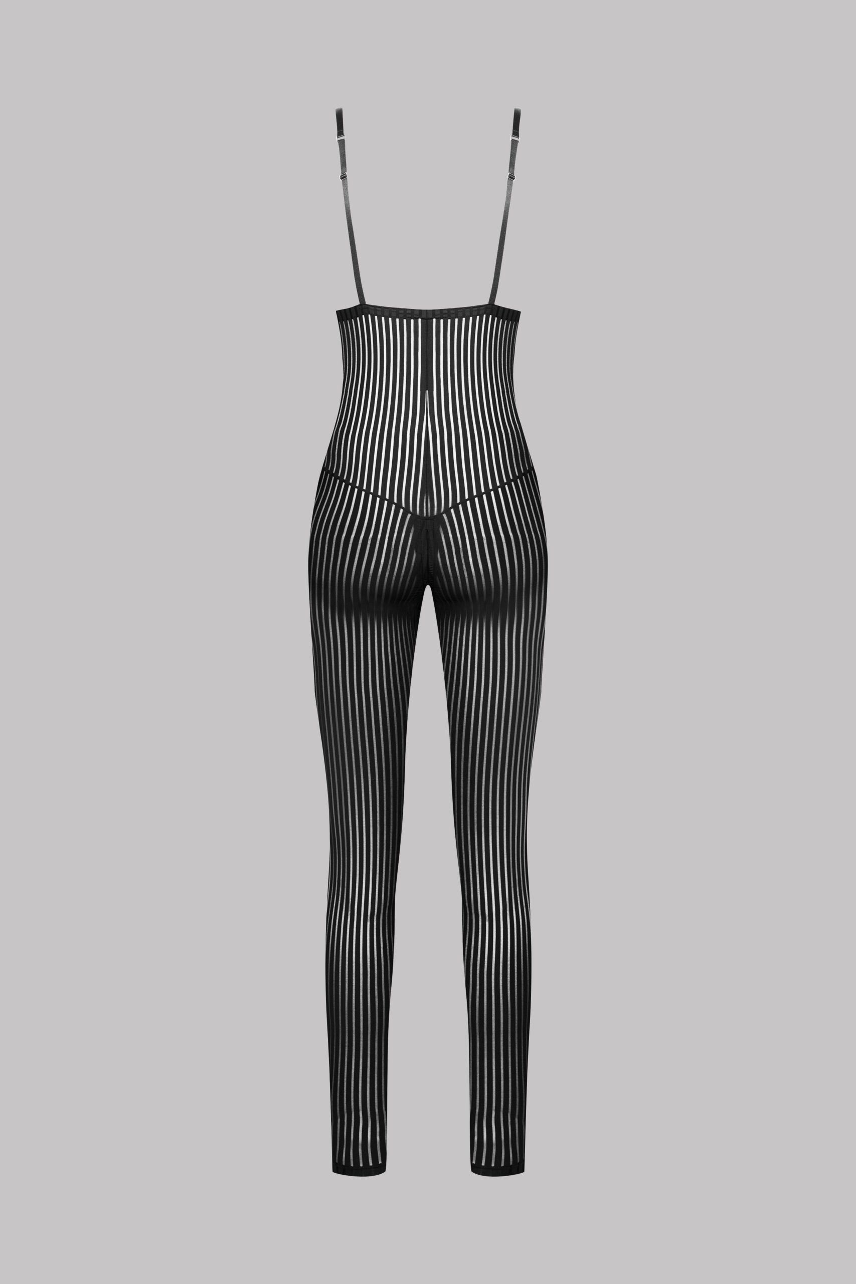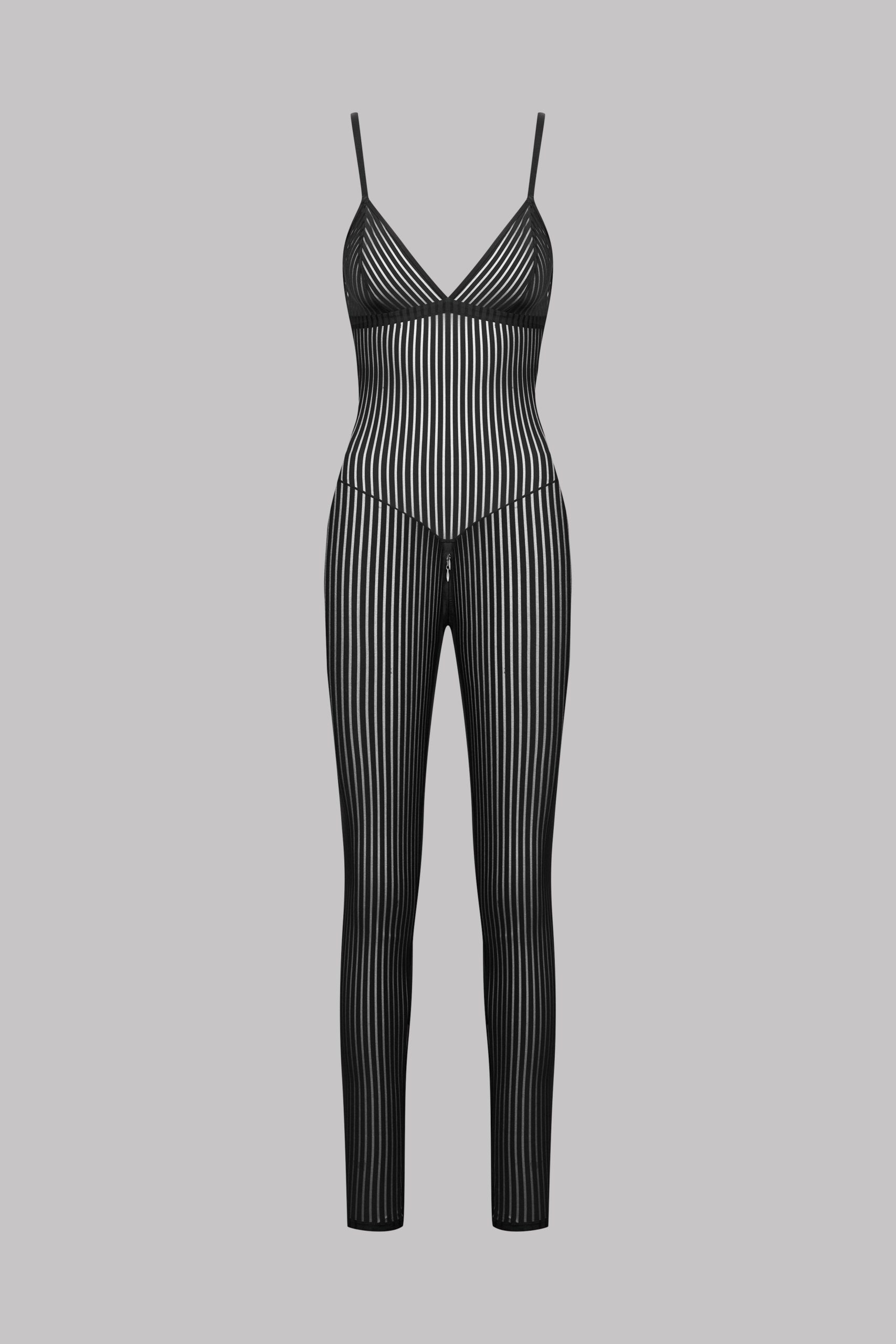 Microfibre catsuit with openwork, transparency and graphic stripes. A mesmerising garment that elongates the body. Triangle cups give a plunging neckline. Opens at the crotch with a front to back zip. Elastic, detachable straps with silver accents.
