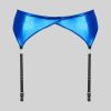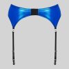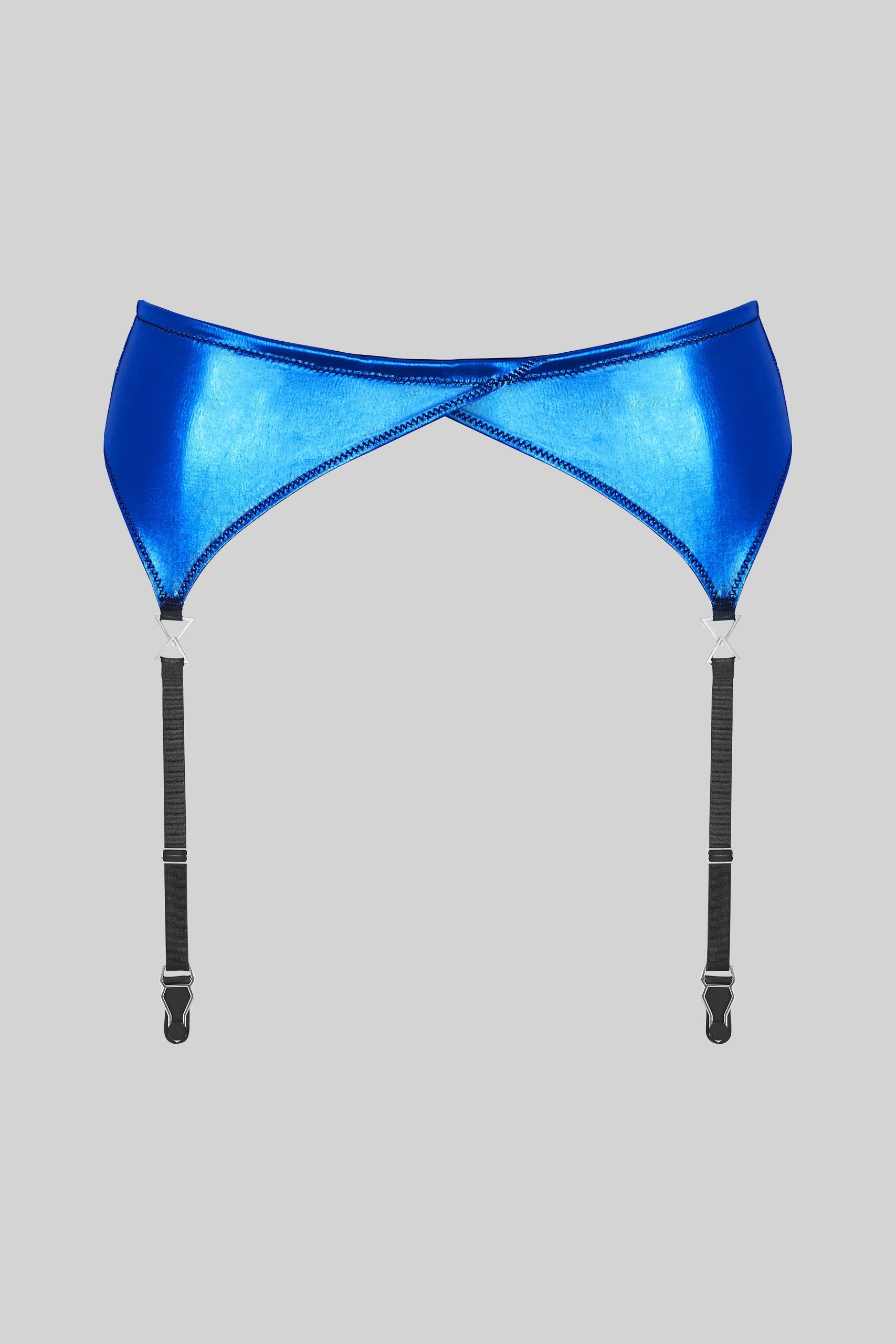 Garter belt in microfiber with metallic foil application. Elastic straps attach with butterfly fasteners. Adjustable fastening on the back.