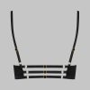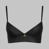 Matte leather effect bustier bra. Half-moon underwired cups without pads . Lined on the front and the cups for a seamless appearance. The collection’s signature “feti-chic” ring embellishes the décolleté, inviting you to attach it. Adjustable hook-and-eye fastening on the back.