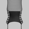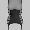Matte leather effect and sheer tulle suspender top. A piece with graphic cut-outs harnessed with adjustable straps on the sides. Four adjustable and removable suspenders. The collection’s signature golden “feti-chic” ring embellishes the front, inviting you to attach it.