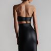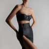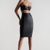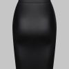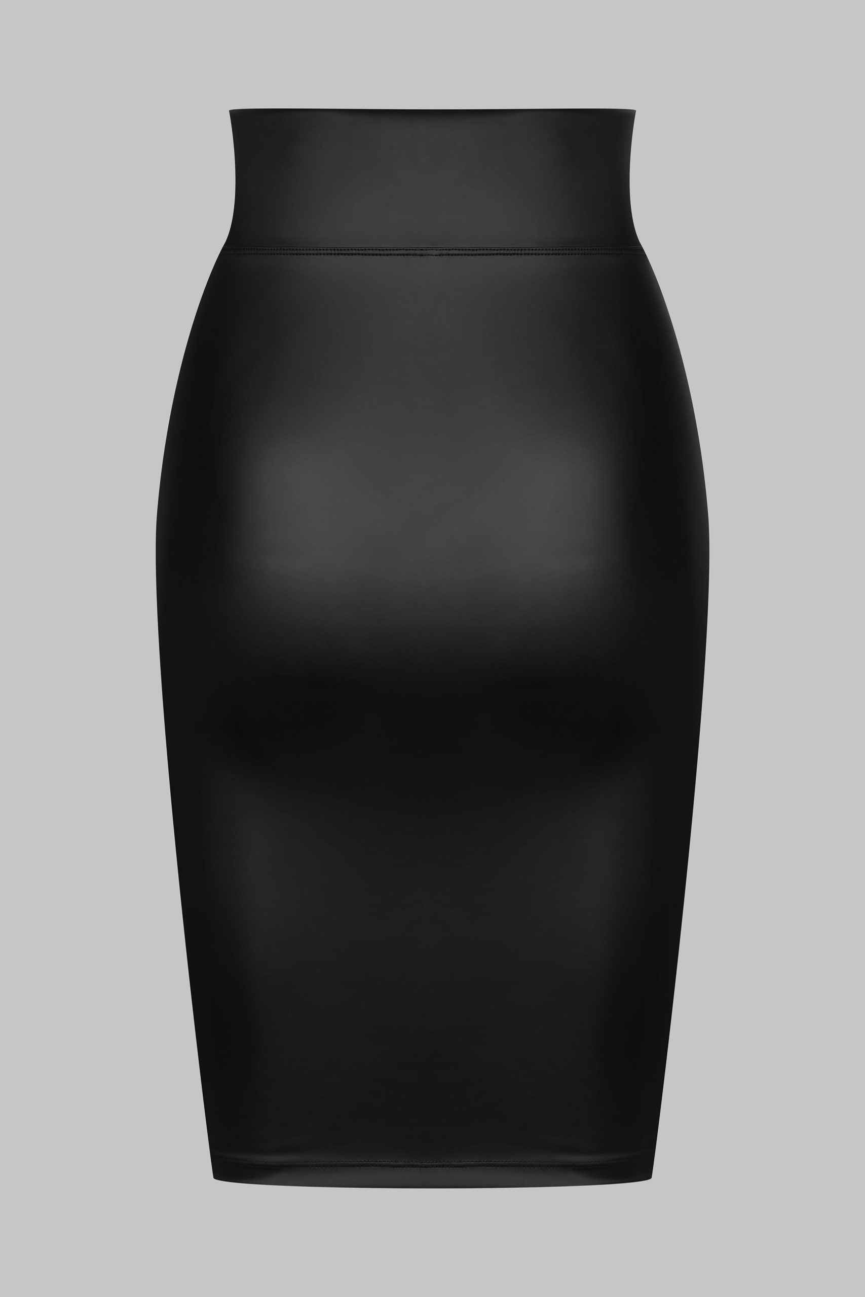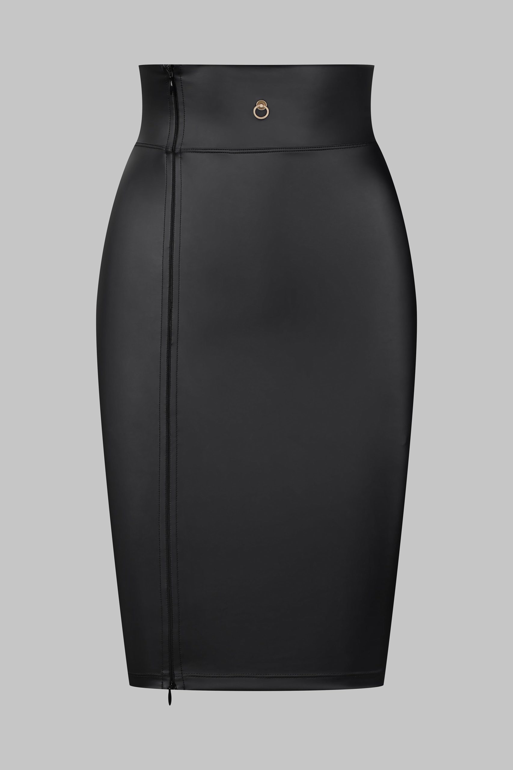 Matte leather effect skirt Bodycon cut and wide belt to show off the figure. Opens at the front with a tone-on-tone two-way zip. The collection’s signature golden “feti-chic” ring embellishes the front, inviting you to attach it.