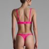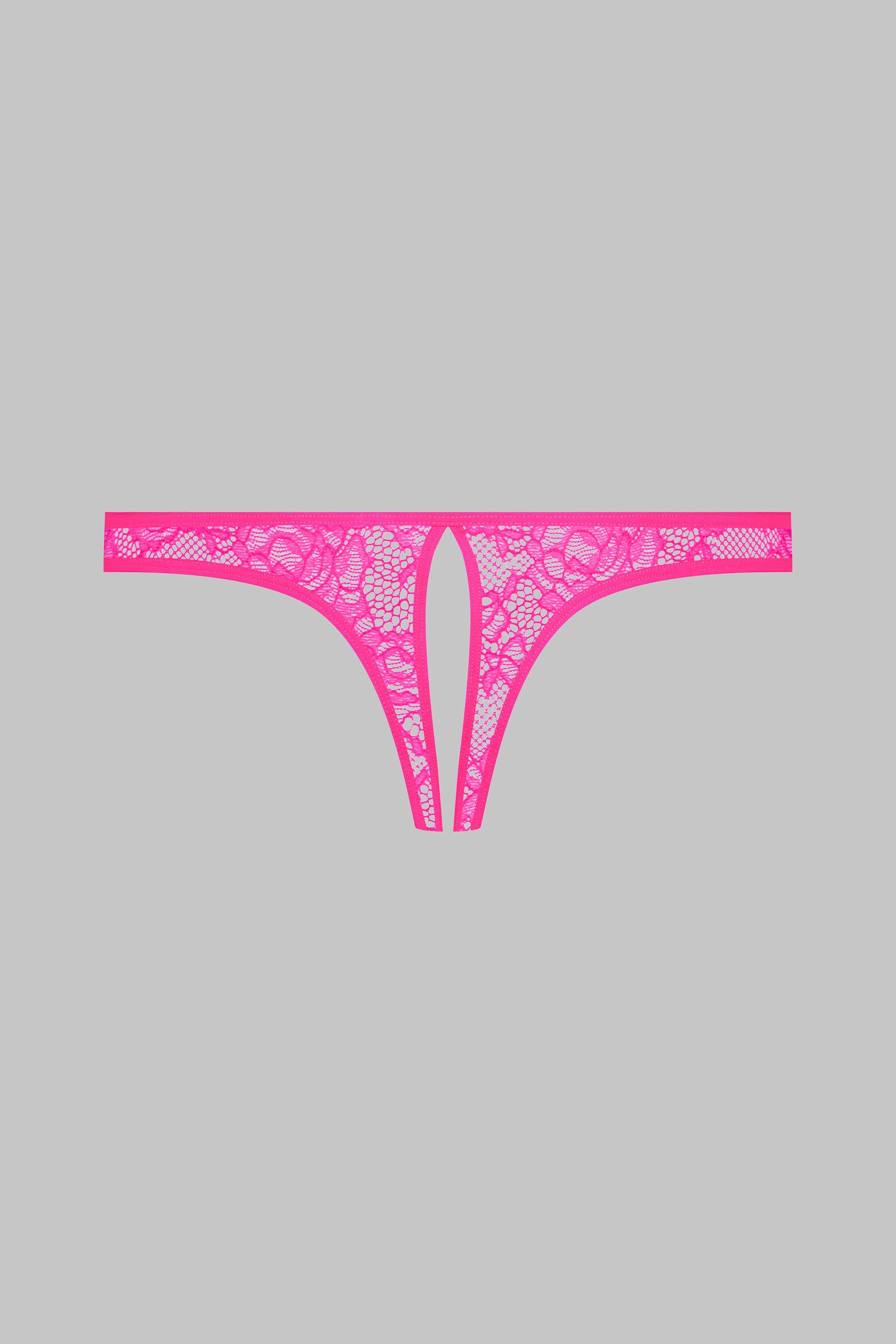 These neon-coloured open briefs feature mostly recycled openwork lace. Alongside a flat elasticated trim, the opening at the back creates a beautiful heart shape to accentuate the buttocks.