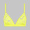 This triangle bra without underwiring in a fluorescent colour features mostly recycled openwork lace. Signature adjustable and removable neon straps with gold accessories. Swap whenever you like with any other Signature items available in various colours. An opportunity for each Muse to create their own zingy mix and match. Fastens at the back with a smooth, subtle adjustable clip.