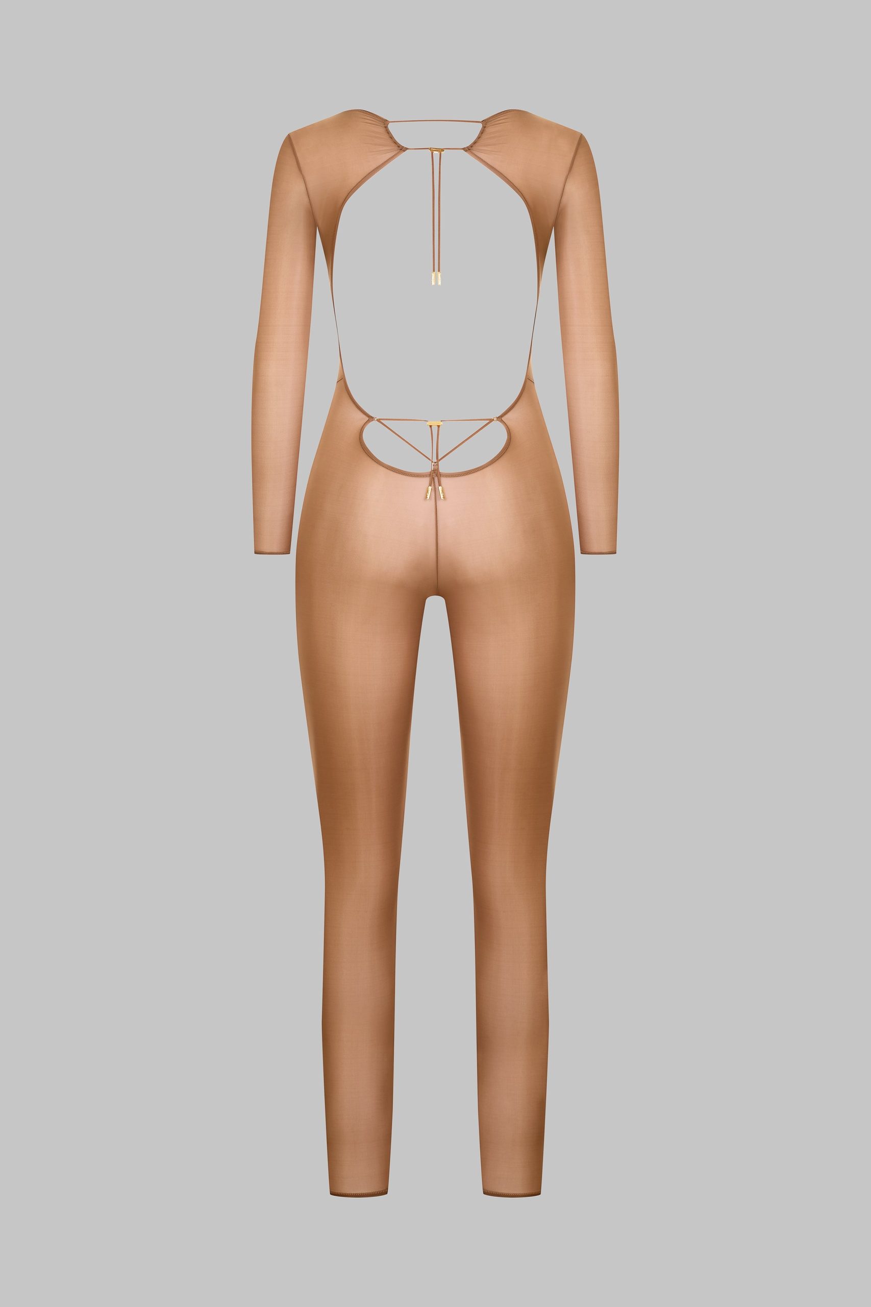 Long sleeve catsuit with round neckline crafted from a fine jersey with shiny, subtly sheer reflections. The front reveals a minimalist and refined silhouette, while the back is fully exposed down to the small of the back with delicately ruched lacing at the neck. The lacing is adjustable thanks to unique sliders and gold lipstick accessories signed by Maison Close.