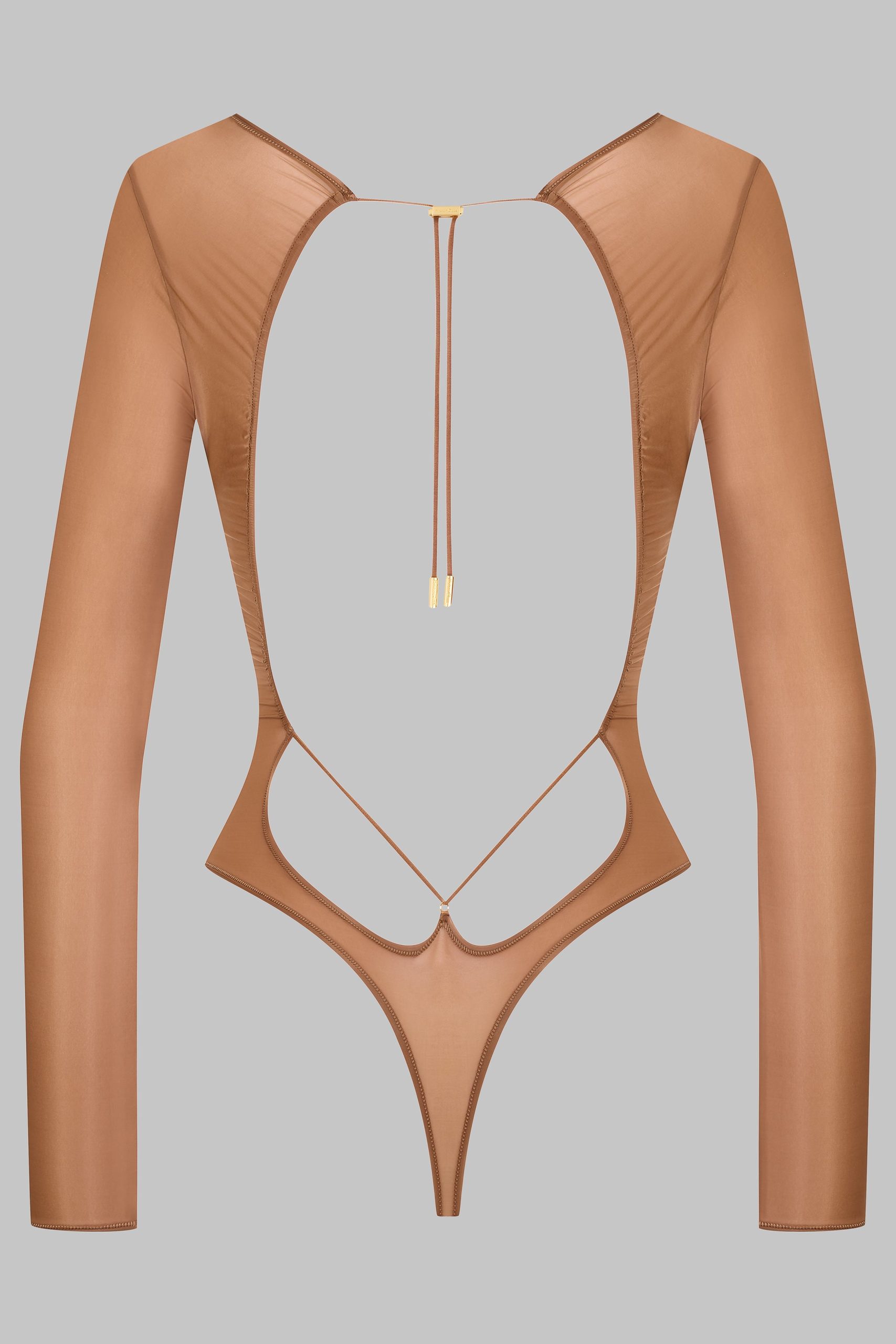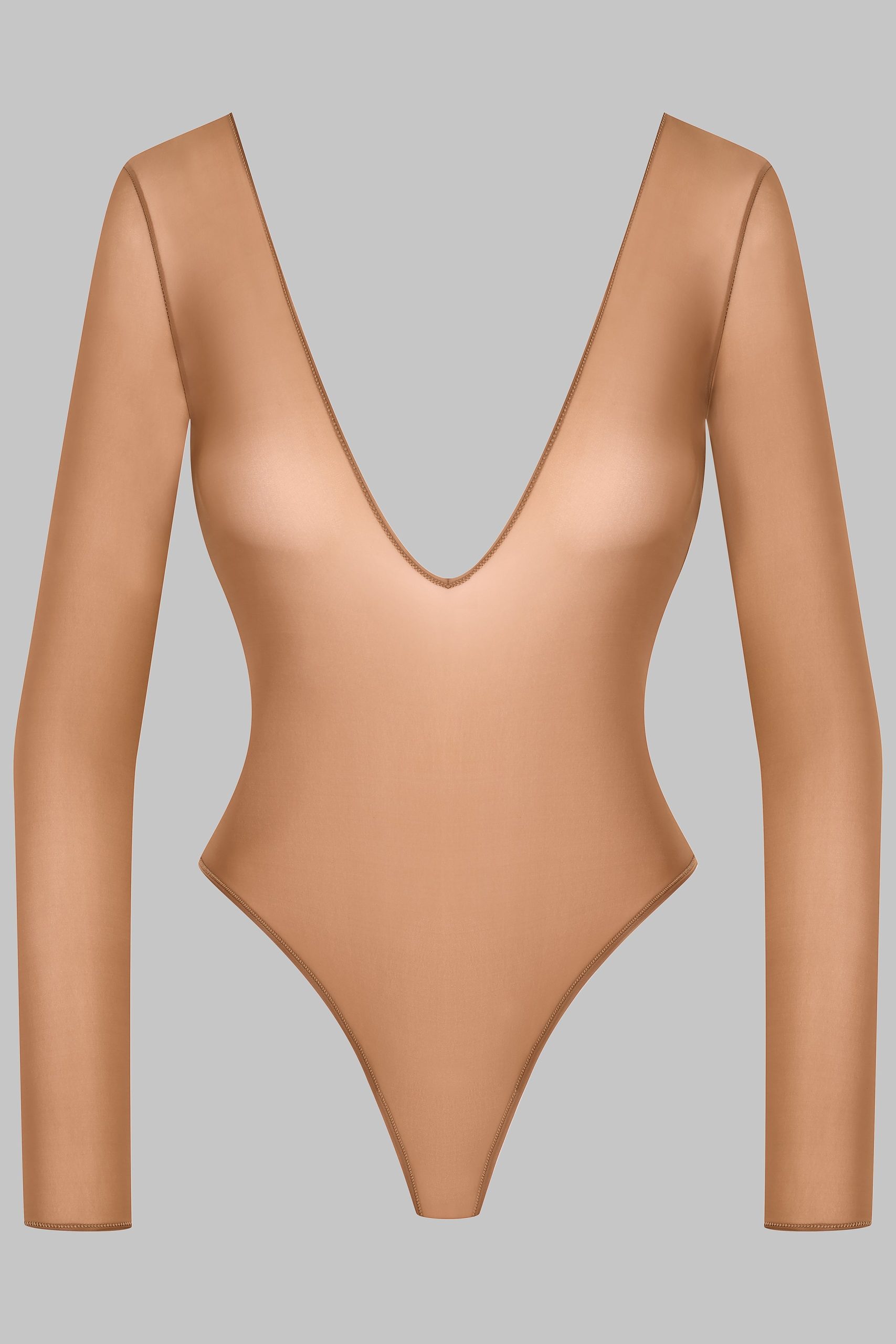 High-cut long-sleeve thong bodysuit crafted from fine jersey with a subtle sheen and delicate transparency.