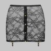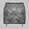 Sheer stretch lace mini skirt. Opens at the front with magnetic gold press-studs. Fastens at the waistband. Four removable garter belt attachments with gold accents.