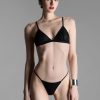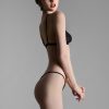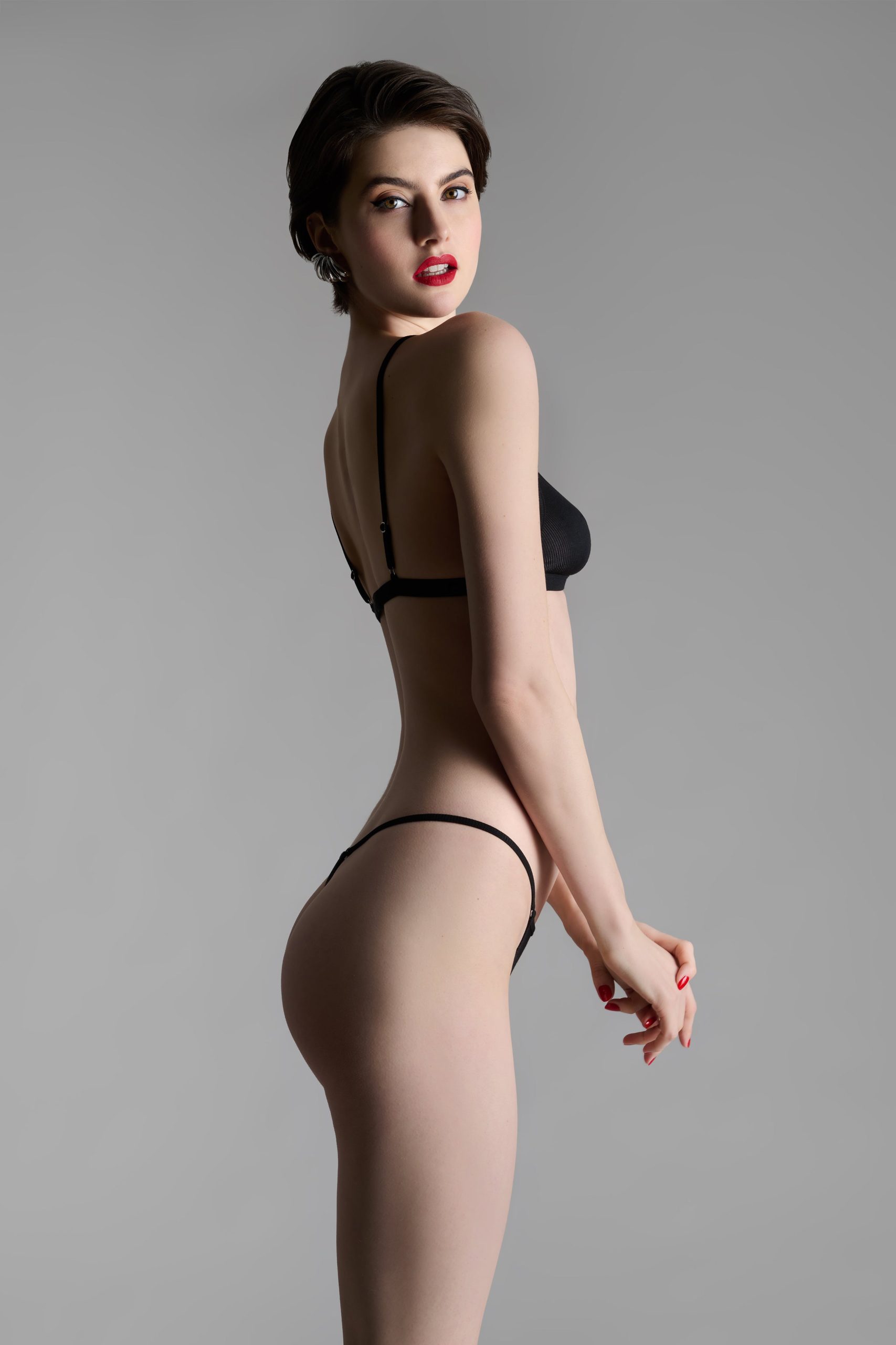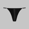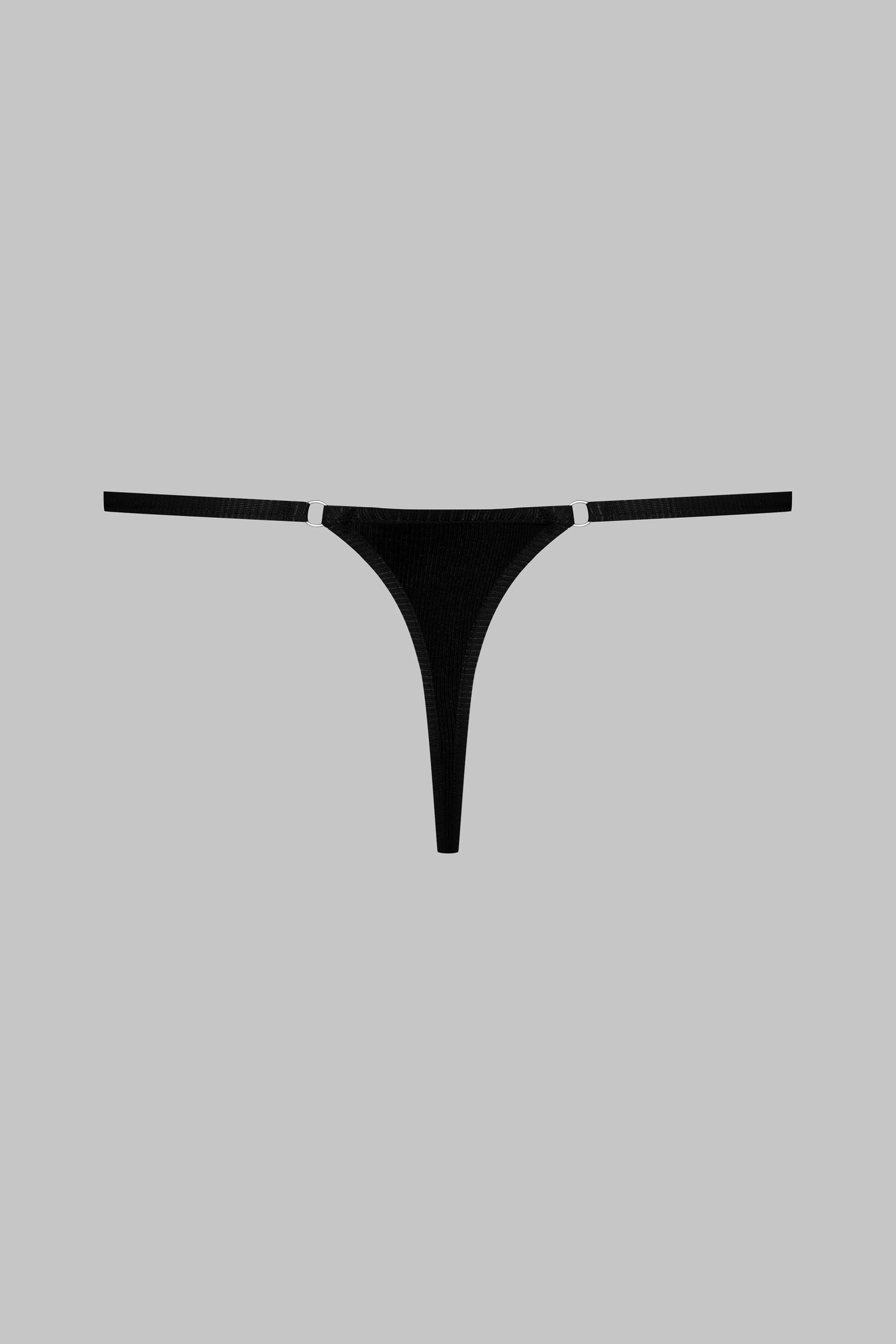 Minimalist mini thong with a unique feel. Stretchy, ultra-soft, lightweight ribbed modal that stretches and has a sheer, shiny sheen. Featuring 2 modal-covered non-removable elasticated straps with adjustable silver trim. Cotton-lined crotch.