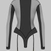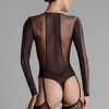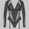 Thong bodysuit in 100% sheer mesh. Multiple seams and lined mesh to shape the silhouette. Adjustable and removable garters. Bodysuit opens with a hook and loop closure at the crotch.