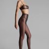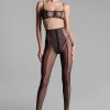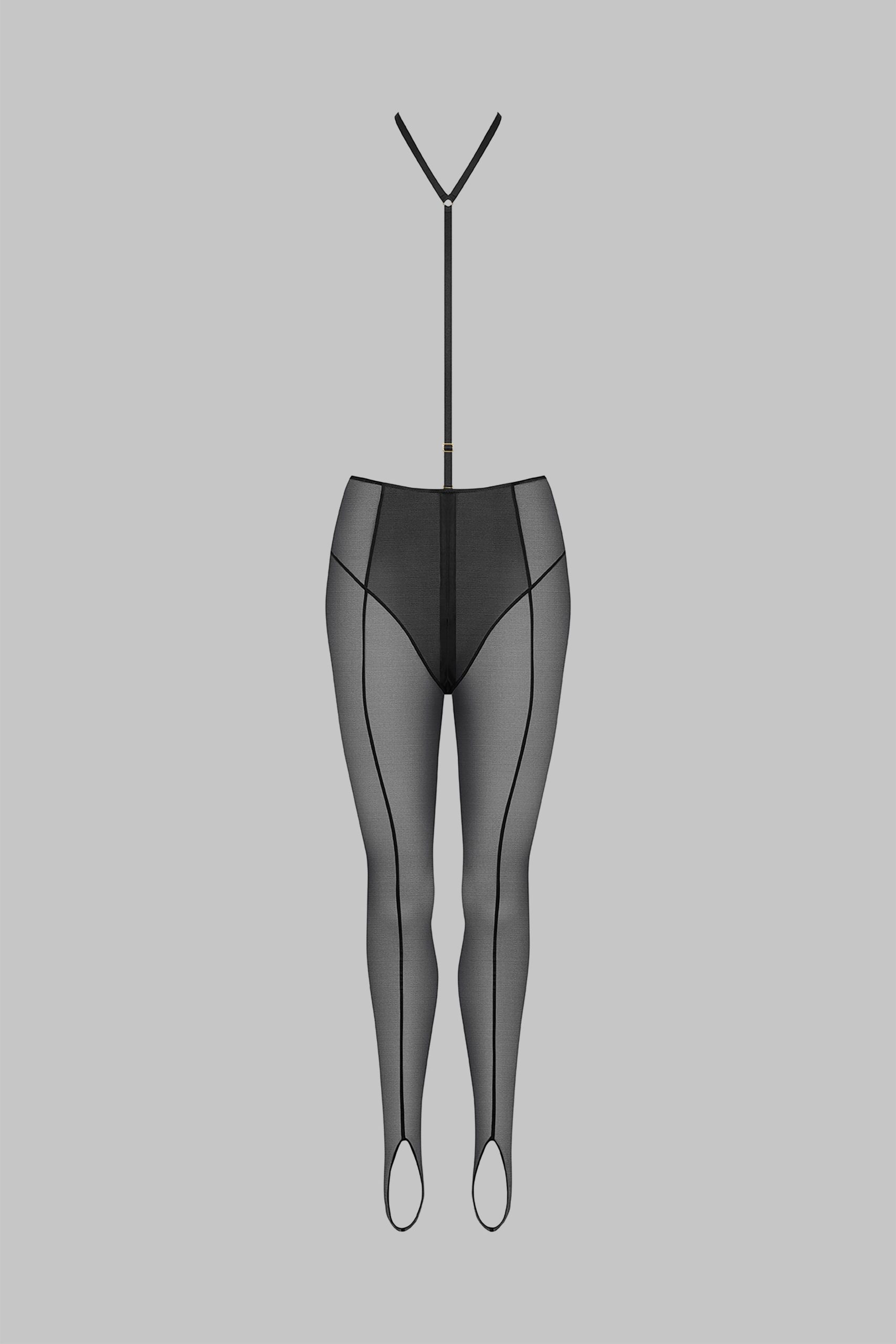 Stirrup leggings in 100% sheer mesh. Multiple seams that structure the entire silhouette. Double seam stocking effect with stirrups. High-waisted and lined in the front and back. Removable and adjustable neck harness. Two-way zipped crotch.