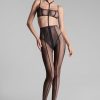 Stirrup leggings in 100% sheer mesh. Multiple seams that structure the entire silhouette. Double seam stocking effect with stirrups. High-waisted and lined in the front and back. Removable and adjustable neck harness. Two-way zipped crotch.