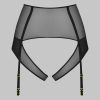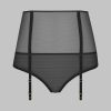 High-waist tanga in 100% sheer mesh. High-waisted belt structured by flexible boning. Two superimposed front panels open at the crotch to reveal beautiful heart-shaped buttocks. Removable and adjustable garters.