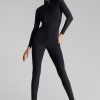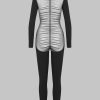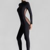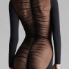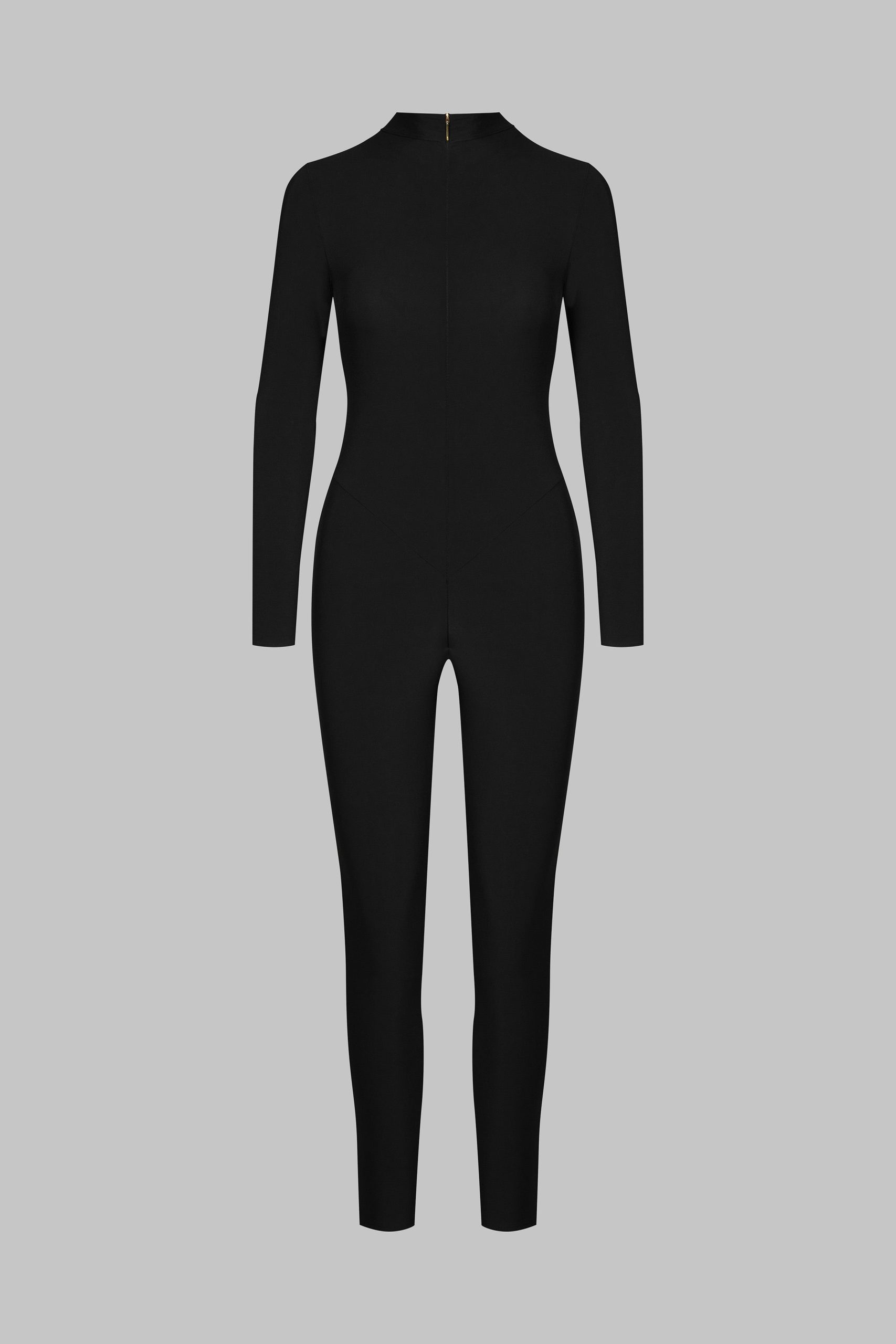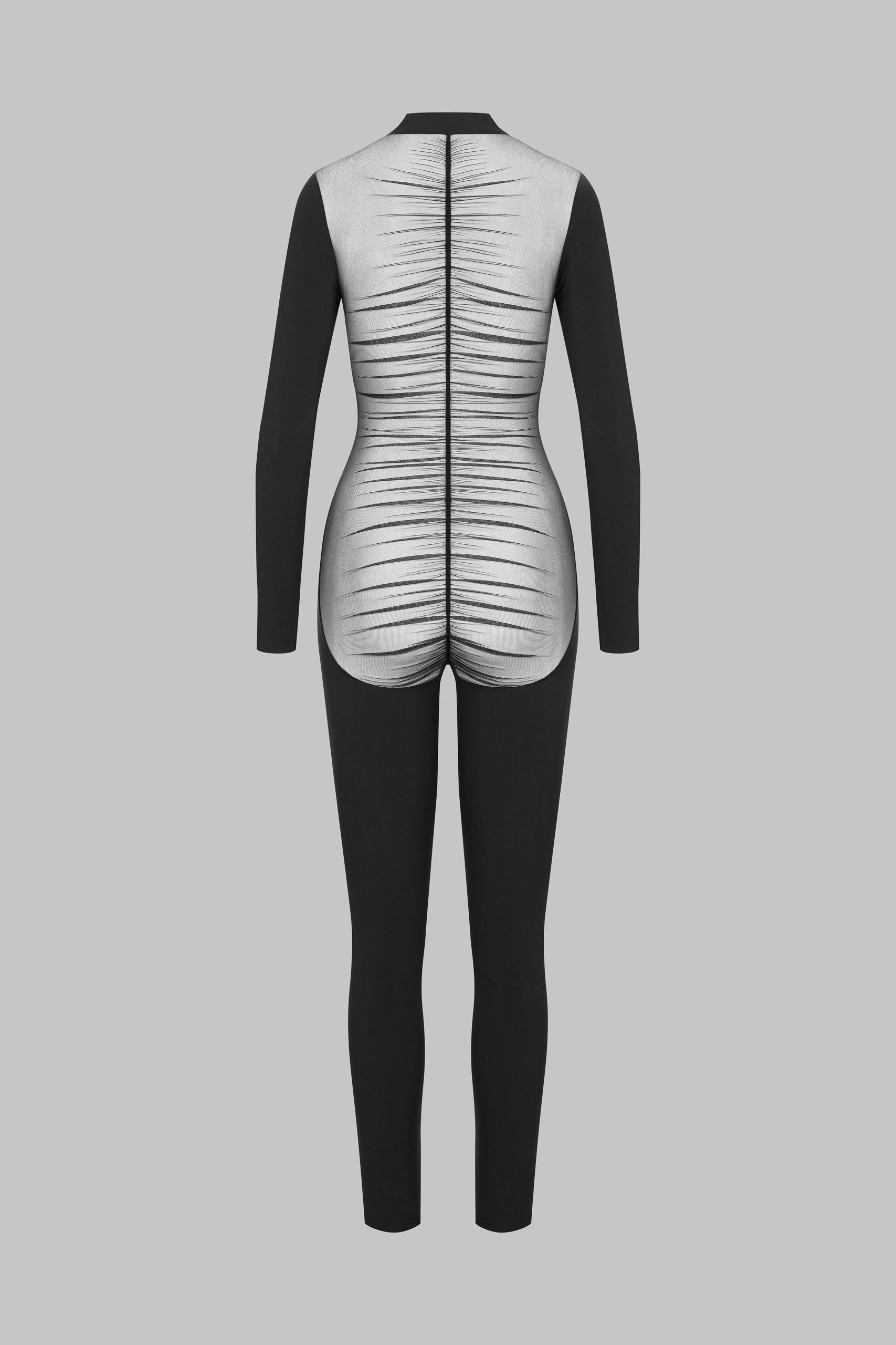 A long-sleeved, bi-material catsuit, where the back makes a bold statement beneath a completely transparent tulle, structured with pleats and seams that extend right down to the buttocks. At the front, an entirely opaque material creates a double light-dark effect. A zip with a gold jewel opens from the high collar.