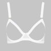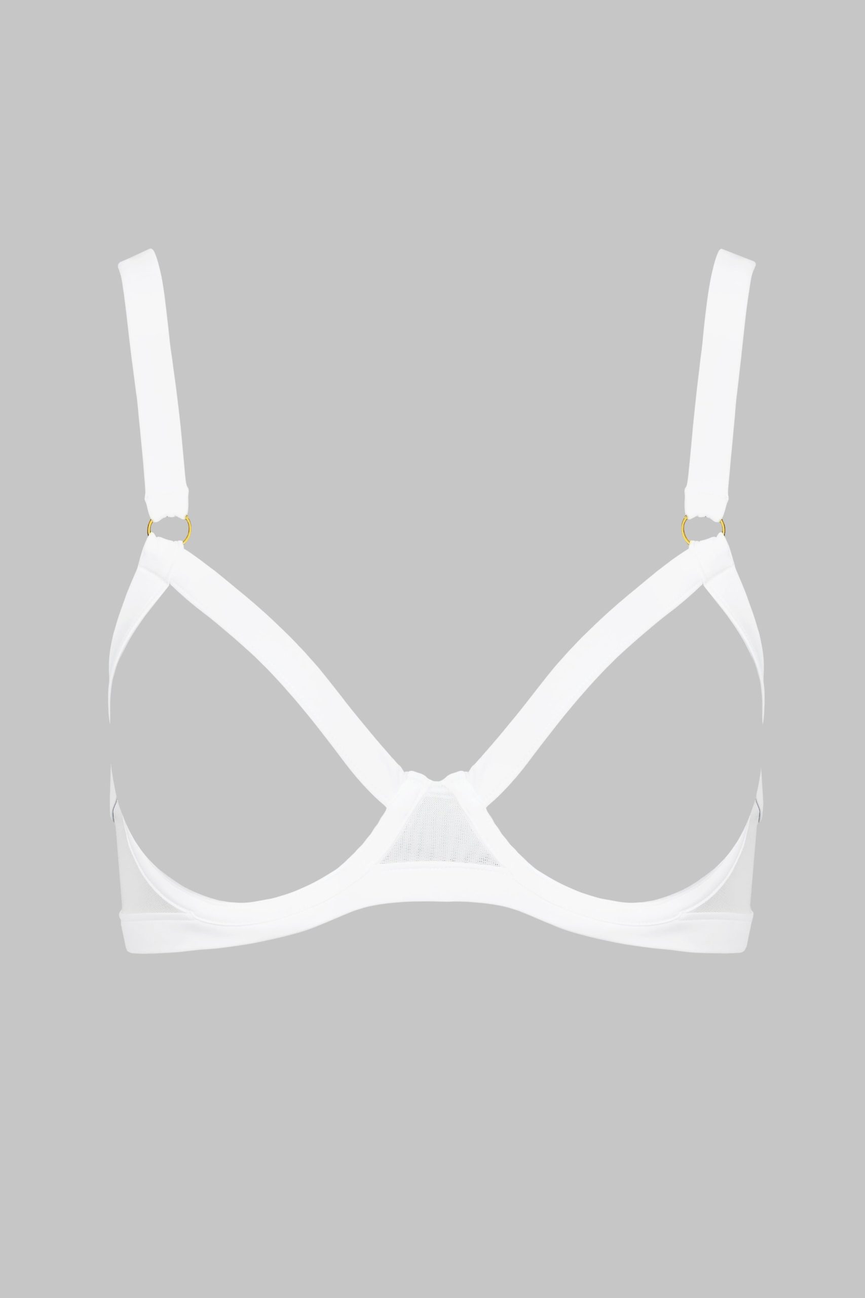 Underwired peekaboo bra with wide straps covered with semi opaque microfibre. Tulle insert at back. This piece has no cups and boldly reveals your breasts. Adjustable straps with gold hardware ensure a snug fit. Closes at the back with a comfortable hook and eye fastening.