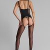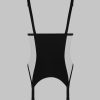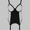 The open shape with underwires structures the bust while leaving the front largely exposed in a confident display. Adjustable straps adapt to the body’s line, while non-removable but adjustable garters extend the look downward—worn with or without stockings.
