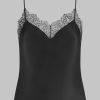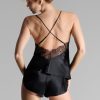 Camisole in natural silk and eyelash lace. Ultra-feminine cut with a V neckline and bare back adorned with rigid lace that delicately hugs the figure. Fine silk adjustable straps with golden accessories cross the back.