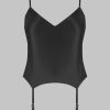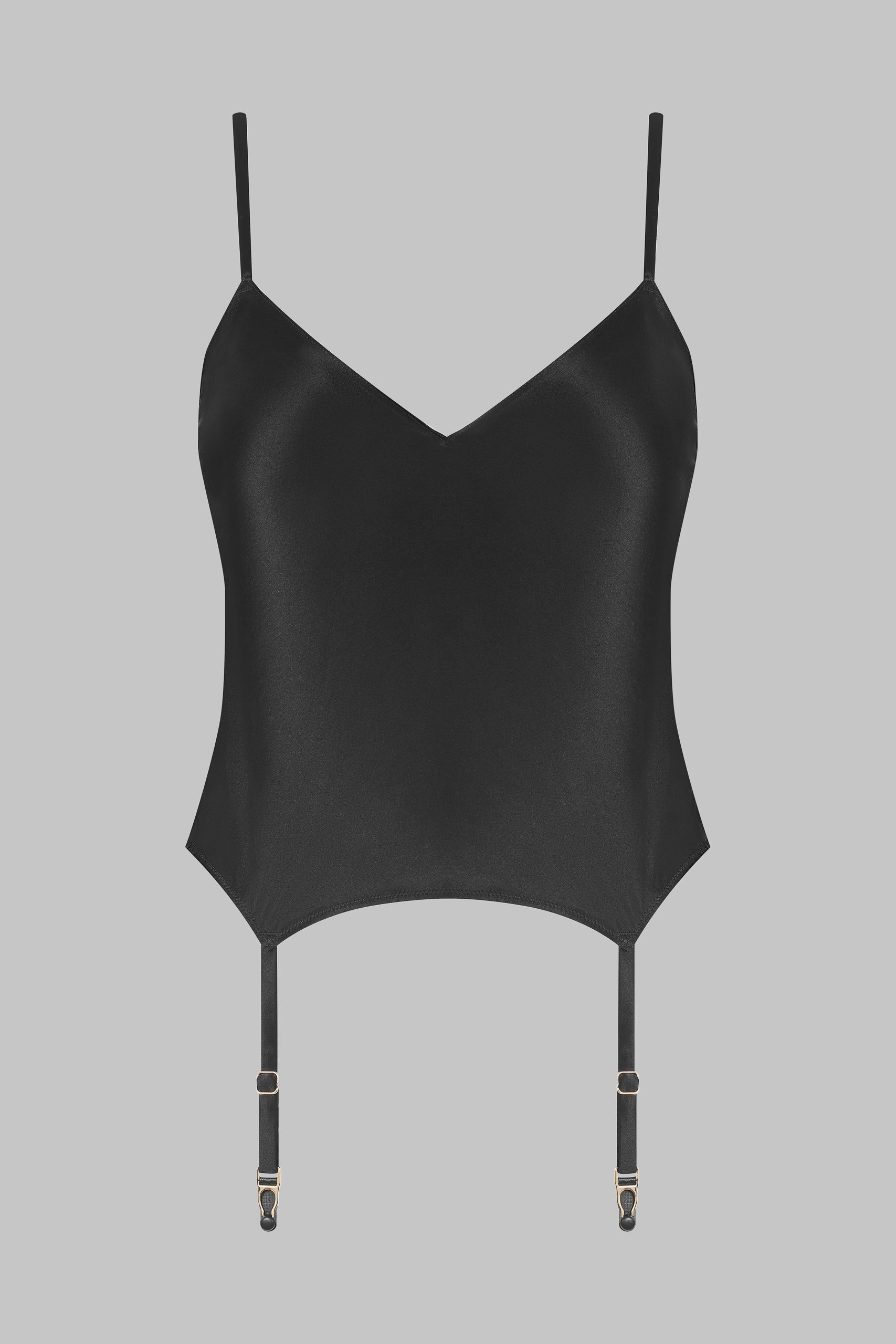 Suspender tank top in natural silk. A V neckline delicately holds the bust. Four fixed, adjustable suspender straps with gold accents. Adjustable silk straps with golden accessories. Exceptional lingerie with an impeccable fit to wear with nylon stockings.