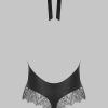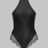 Thong body with American neckline in silk and eyelash lace. Scoop cut adorned with rigid lace that subtly shows-off the hips and buttocks. An American neckline delicately reveals the bust. Neck closure with silk ribbon to tie as you desire. Non-openable crotch for extra comfort.