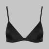 Natural silk triangle bra. Triangle cups without underwire that hold the breasts perfectly. Thin straps covered with gathered silk at the front and adjustable elastics at the back with golden accessories. Elastic band covered with gathered silk beneath the breasts. Fastens at the back with a adjustable clip.