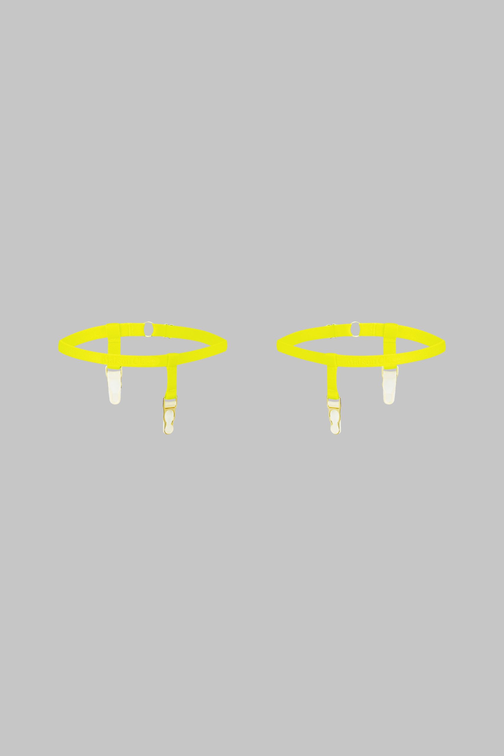 Two neon Signature garters stamped with the Maison Close logo. Adjustable elasticated bands with gold accents. Movable mini suspender straps for positioning on either side of the leg once the garter is adjusted.