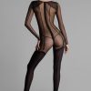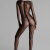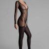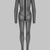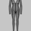 Catsuit in 100% sheer mesh. Multiple seams that structure the entire silhouette. Double seam stocking effect with stirrups. Removable outer garters for layering stockings and playing with transparency. Full zipped bodice that can be opened from either direction. Lined mesh at the shoulders.