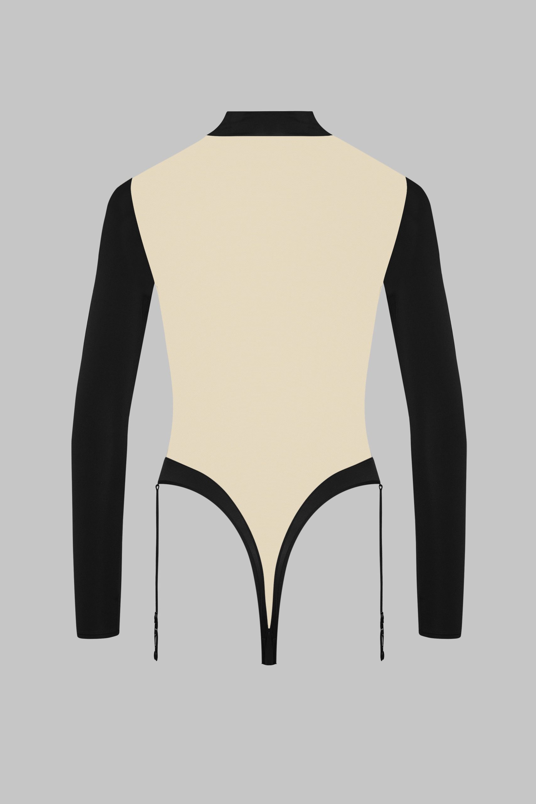 The V-neck long-sleeve thong bodysuit with garter straps – Pure Tentation is both sculptural and delicate. Its plunging V-neck highlights the bust, while the ultra-sheer back boldly reveals the skin. The mix of airy tulle and opaque microfiber creates a refined play of contrasts. Long sleeves extend the body’s line, and adjustable, removable side garters offer styling versatility. The discreet thong shape is paired with cotton lining at the crotch. Convenient hook-and-eye closure at the crotch.